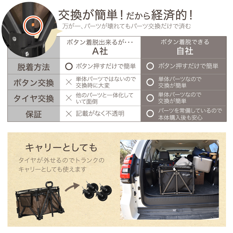 トップ > アウトドア > キャリーワゴン > ライシン アウトドアワゴン Eシリーズ 最大110L 拡張機能 キャリーワゴン キャリーカート ミニ 折りたたみ 【1年保証】 アウトドア > キャリーワゴン > Eシリーズ > ライシン アウトドアワゴン Eシリーズ 最大110L 拡張機能 キャリーワゴン キャリーカート ミニ 折りたたみ 【1年保証】