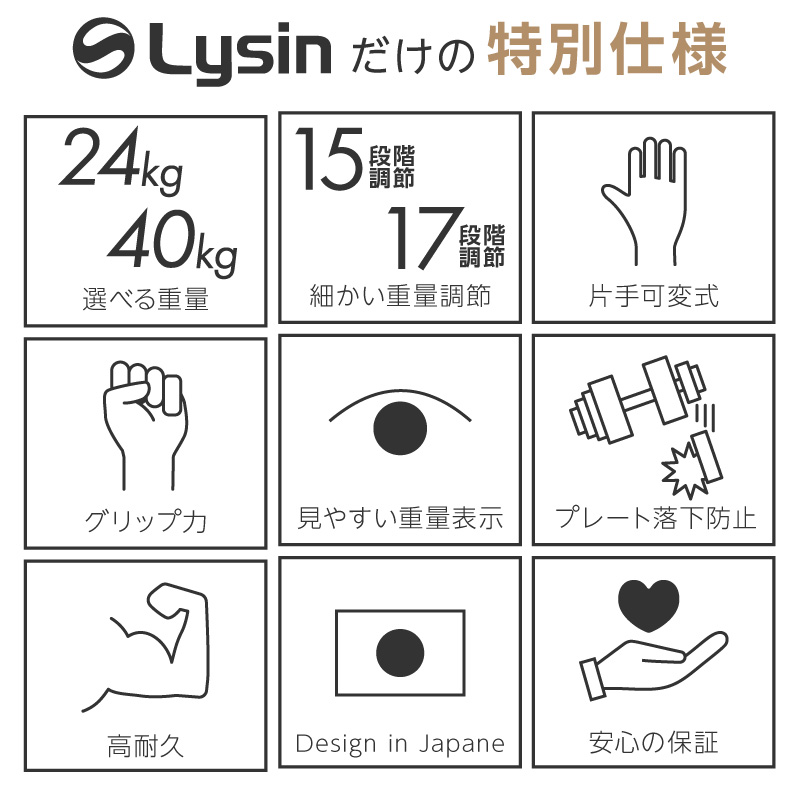 ■24kg(15段階):2.5kg 3.5kg 5kg 6kg 7kg 8kg 9.5kg 10.5kg 11.5kg 13.5kg 16kg 18.5kg 20.5kg 23kg 24kg