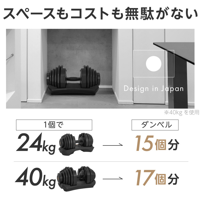 1年くらい前に買った24kgの両手で重量可変タイプのハンドルが壊れたので、この機会に40kgに買い替えようと思っていたところ、片手タイプを発見!しかも両手式より安い!新発売だから!?安くてある意味心配だったけど、商品はイメージどおり!後は1年以上使えれば、この価格なら文句無し!
